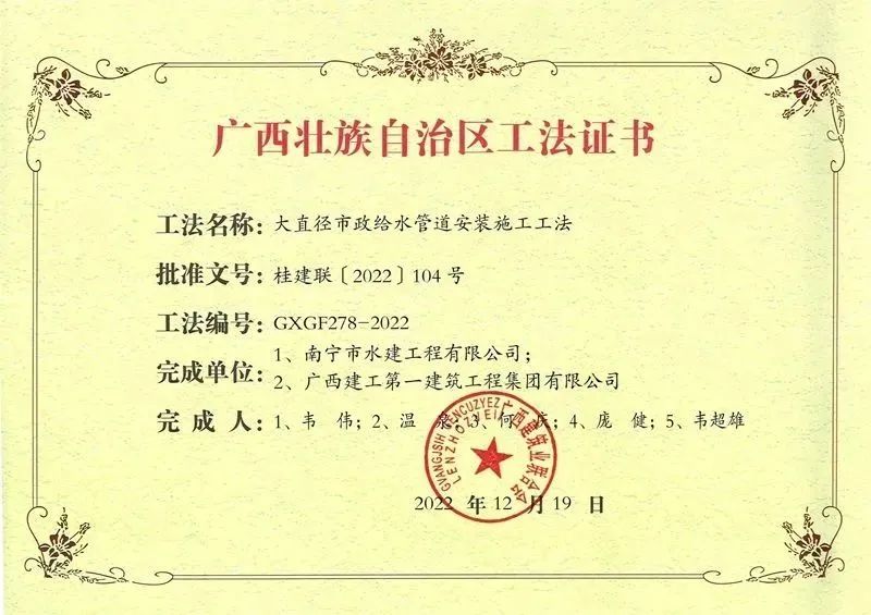在2022年度廣西壯族自治區(qū)級(jí)工程建設(shè)工法評(píng)審活動(dòng)中,由廣西綠城水務(wù)股份有限公司下屬南寧市水建工程有限公司(下簡(jiǎn)稱(chēng)“水建公司”)組織申報(bào)的《大直徑市政給水管道安裝施工工法》,經(jīng)自治區(qū)級(jí)工程建設(shè)工法評(píng)審委員會(huì)評(píng)審,成功獲評(píng)為2022年廣西壯族自治區(qū)級(jí)工程建設(shè)工法。