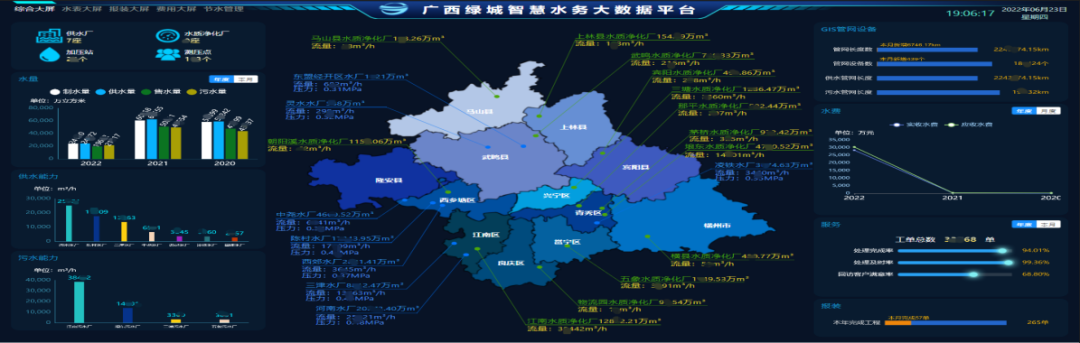 綠城水務(wù)大數(shù)據(jù)平臺于2019年9月啟動建設(shè),于2020年12月建成,主要包括數(shù)據(jù)機房和平臺軟件建設(shè),投資約1100萬元,該平臺于2021年6月取得了國家版權(quán)局頒發(fā)的計算機軟件著作權(quán)登記證書。綠城水務(wù)大數(shù)據(jù)平臺是綠城水務(wù)整個智慧水務(wù)項目的數(shù)據(jù)大腦,平臺按“一個中心、三大體系、五大板塊”的架構(gòu)設(shè)計,整合了營銷收費系統(tǒng)、報裝系統(tǒng)、生產(chǎn)調(diào)度系統(tǒng)、地理信息系統(tǒng)、供水服務(wù)熱線系統(tǒng)的運行數(shù)據(jù),通過可視化圖形直觀呈現(xiàn)平臺數(shù)據(jù),以更加“智慧”的方式輔助水務(wù)企業(yè)進行管理和運維,為業(yè)務(wù)開展及管理決策提供了精準、及時、有效的數(shù)據(jù)支撐,保證可靠供水,降低產(chǎn)銷差,提升運營管控能力,以數(shù)字化轉(zhuǎn)型賦能企業(yè)高質(zhì)量發(fā)展。