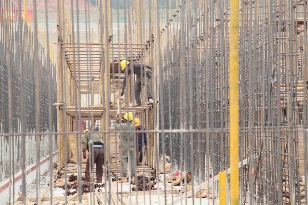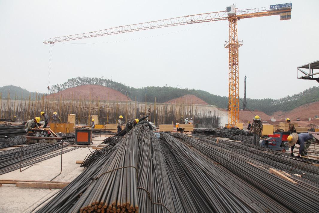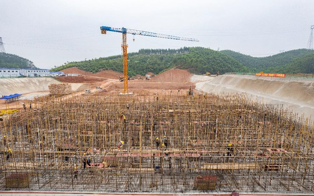 3月24日,在五象水廠一期工程項目施工現場,工程車輛來往穿梭,大型塔吊協同作業,工人忙著綁扎鋼筋,3號清水池的根基框架初見雛形。