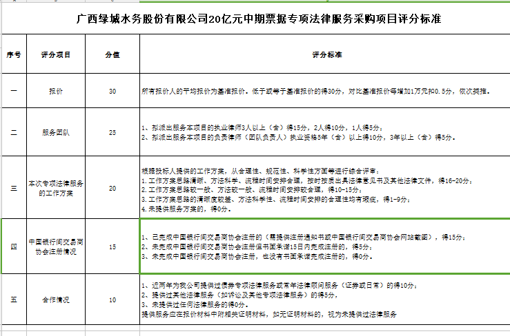 附件:廣西綠城水務股份有限公司20億元中期票據(jù)專項法律服務采購項目評分標準